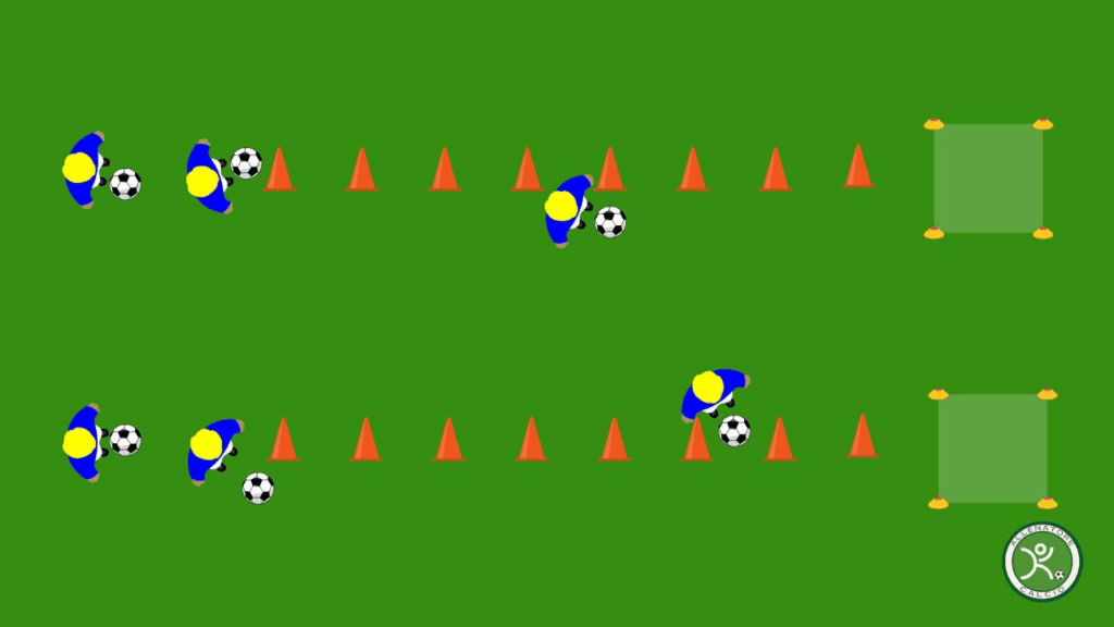 I bambini conducono il pallone in slalom tra i coni, cercando di mantenere il controllo ravvicinato e la testa alta. Alla fine del percorso devono fermare la palla in un’area delimitata.