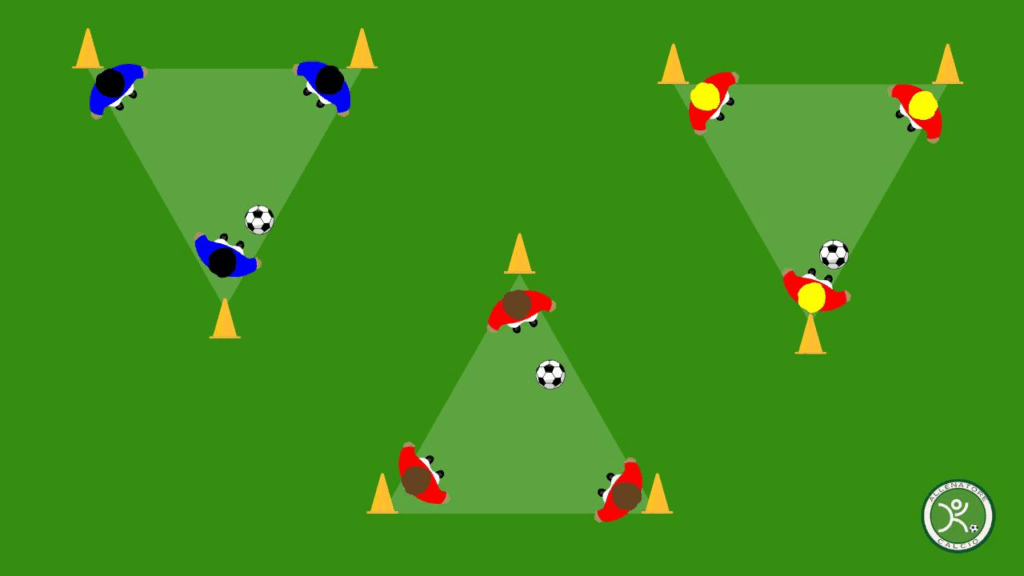 Si dispongono 3 bambini a formare un triangolo con i coni come riferimento. I bambini devono passarsi il pallone tra loro, controllarlo con un tocco e passarla velocemente a un compagno.