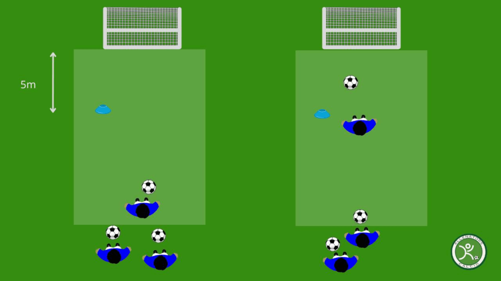 - SPAZIO RICHIESTO: Un rettangolo di 10×15 metri con una mini porta posizionata sul lato corto. Il punto di partenza per il tiro si trova a 5 metri dalla porta, segnato con un cono.