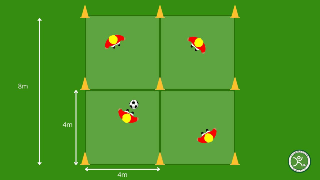 - SPAZIO RICHIESTO: Un rettangolo di 10×7 metri, con una mini porta posizionata su ciascun lato corto. L’area è delimitata da coni per evitare che il pallone esca, e i bambini si sfidano all’interno.