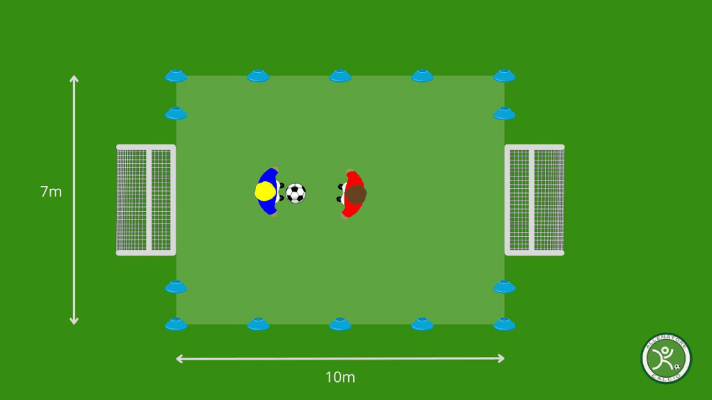 Due bambini si affrontano in un 1 contro 1 in un’area delimitata. L’obiettivo è superare l’avversario e segnare in una delle due mini porte.