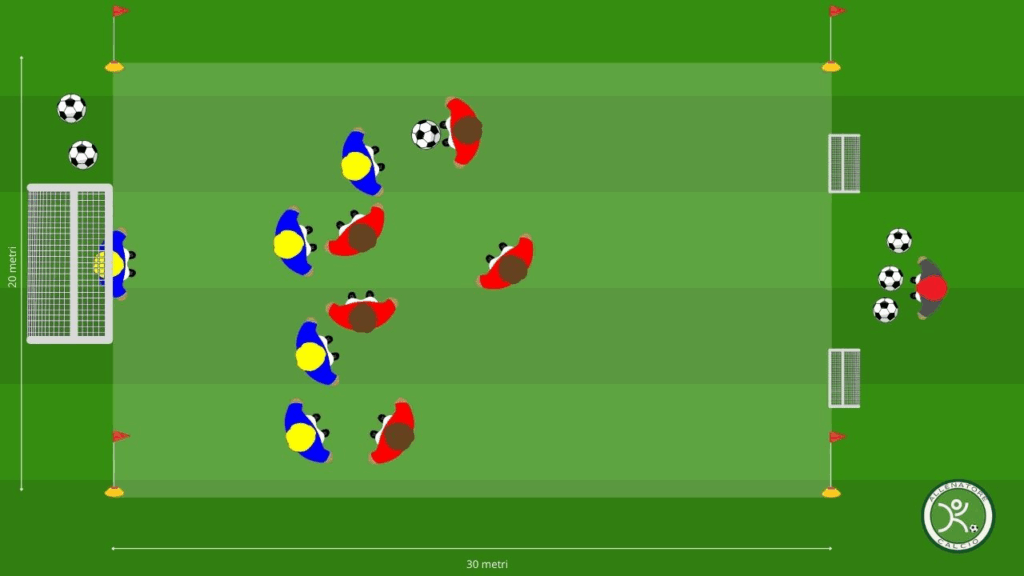- SPAZIO RICHIESTO: Un’area di 30×20 metri per il lavoro difensivo, con una porta regolamentare su un lato e due porticine su quello opposto per rappresentare le transizioni offensive.