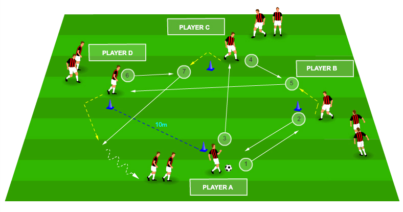 Definiamo un’area di gioco dove la distanza sia di 10 metri tra un cono e l’altro. Disponiamo minimo 2 giocatori per ogni stazione di gioco e massimo 3 giocatori. Andremo a ricreare con una semplice sequenza di trasmissioni e ricezioni un’attivazione con diversi tipi di passaggi : passaggio appoggiato, passaggio filtrante, passaggio corto e passaggio lungo.