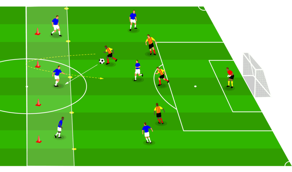 Un esercizio pratico per affinare la capacità di reagire a transizioni negative coinvolge la creazione di scenari mirati che stimolano i giocatori a difendere in numero ridotto, per poi passare rapidamente all’attacco non appena recuperano il pallone.