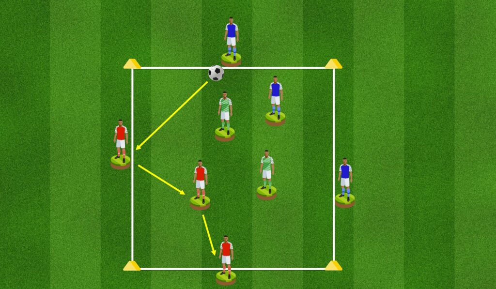Il gioco è concepito come un possesso palla 6 contro 2 in cui i due giocatori verdi all’interno di un quadrato devono cercare di intercettare un passaggio per conquistare il possesso.