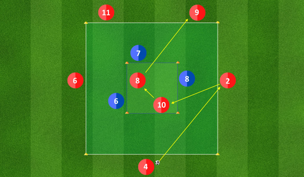 I giocatori rossi all’esterno avranno a disposizione solamente 1 tocco, mentre potranno usufruire di 2 tocchi i giocatori rossi all’interno del quadrato piccolo. Questi 2 giocatori rossi avranno come regola di trasmissione quella di giocare la palla verso un lato diverso da quello di ricezione. I giocatori dovranno essere costantemente in movimento per rendere più facili le linee di passaggio.