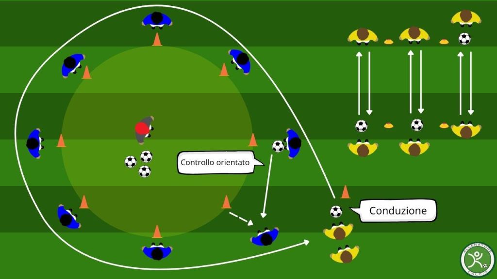 - Migliorare la conduzione orientata del pallone e il controllo orientato durante i passaggi, aumentando concentrazione e precisione tecnica.