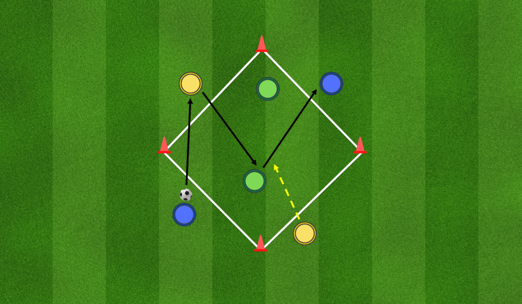 I giocatori all’esterno del perimetro hanno il compito di mantenere il possesso, mentre quelli all’interno hanno l’obiettivo di riconquistare la palla e passarla a uno dei due giocatori con casacca diversa da quella del giocatore che ha sbagliato il passaggio.