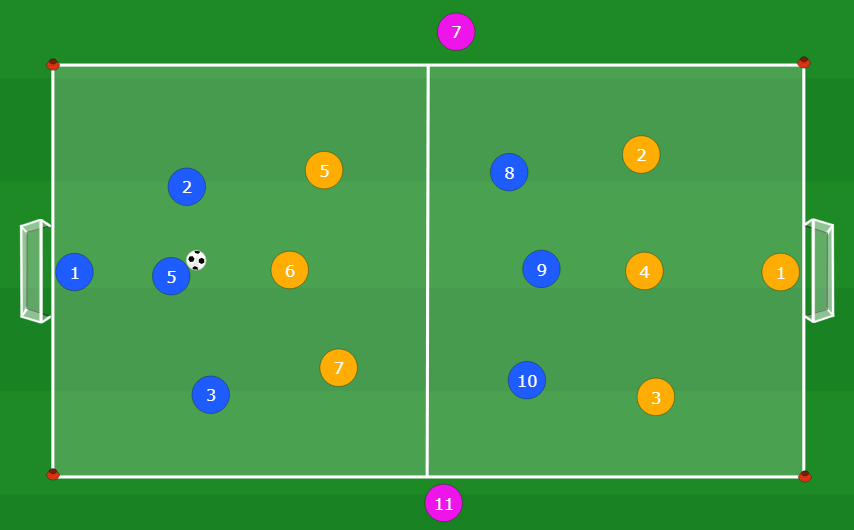 Per preparare questo small sided game definiamo un’area di gioco dove il campo misura in ampiezza 30 metri ed profondità 40 metri. Delimitiamo il perimetro del campo con i cinesini. Il campo sarà diviso a metà utilizzando i cinesini piatti. Ai lati corti andremo a porre le 2 porte dove risiederanno i portieri. Ci saranno poi 2 squadre composte da 6 giocatori ciascuna più 1 portiere per squadra. I giocatori di movimento saranno liberi di disporsi nel campo di gioco. Infine avremo 2 jolly con relative casacche distintive rispetto agli altri giocatori.